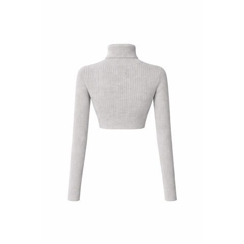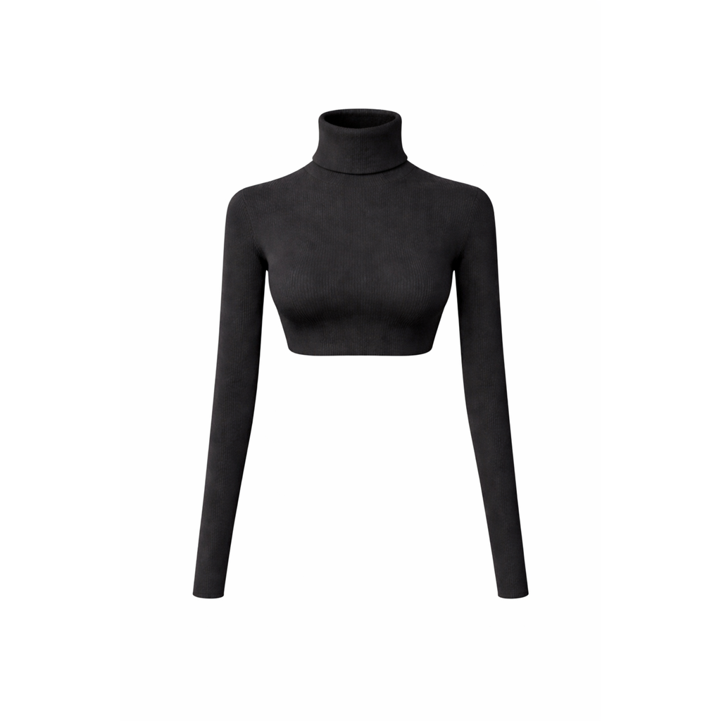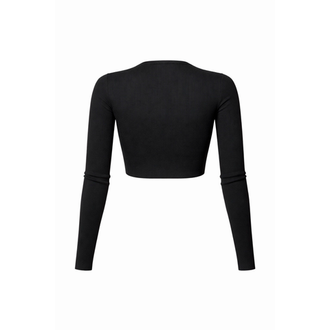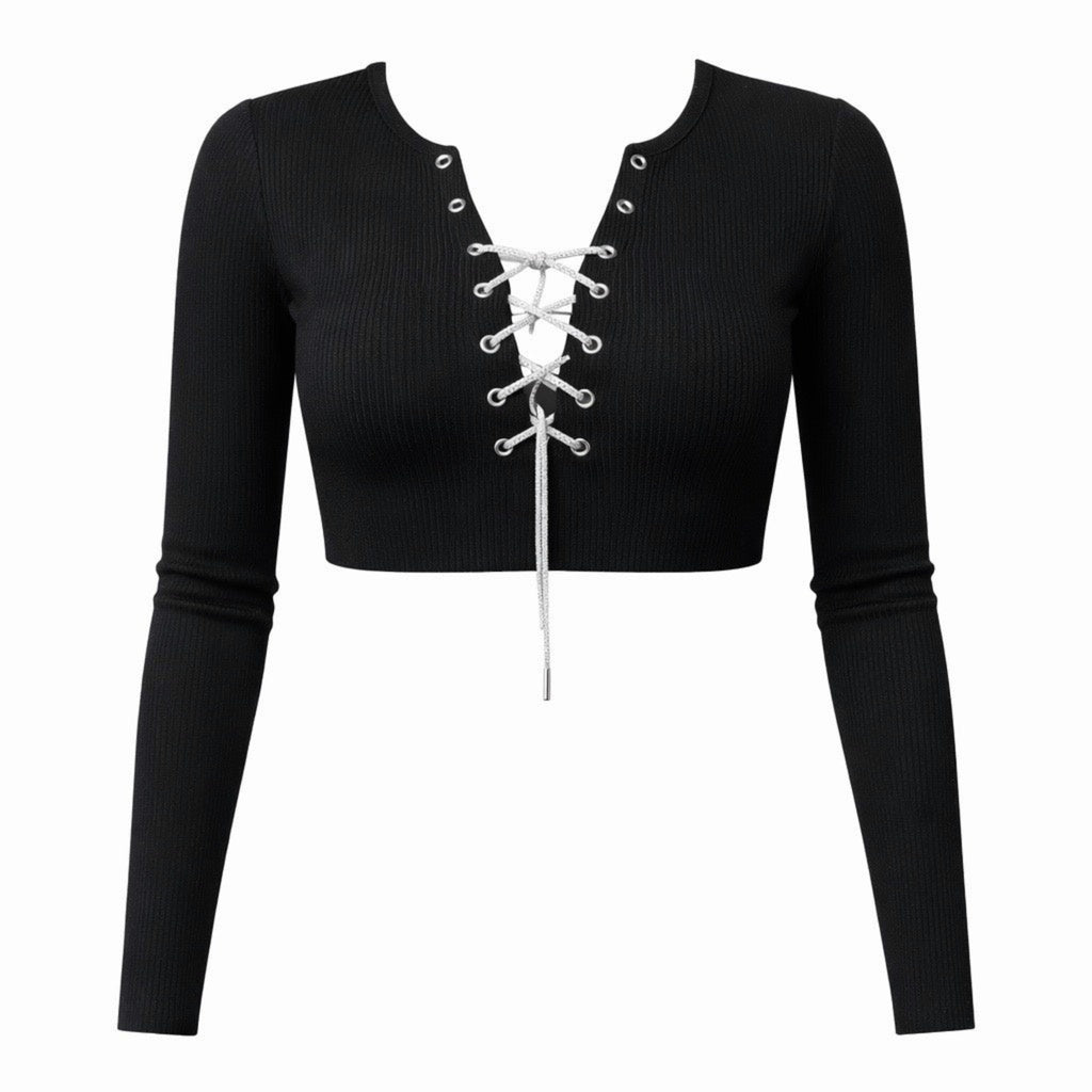Black Ribbed Rhinestone Lace-Up Front Long Sleeve Crop Top
