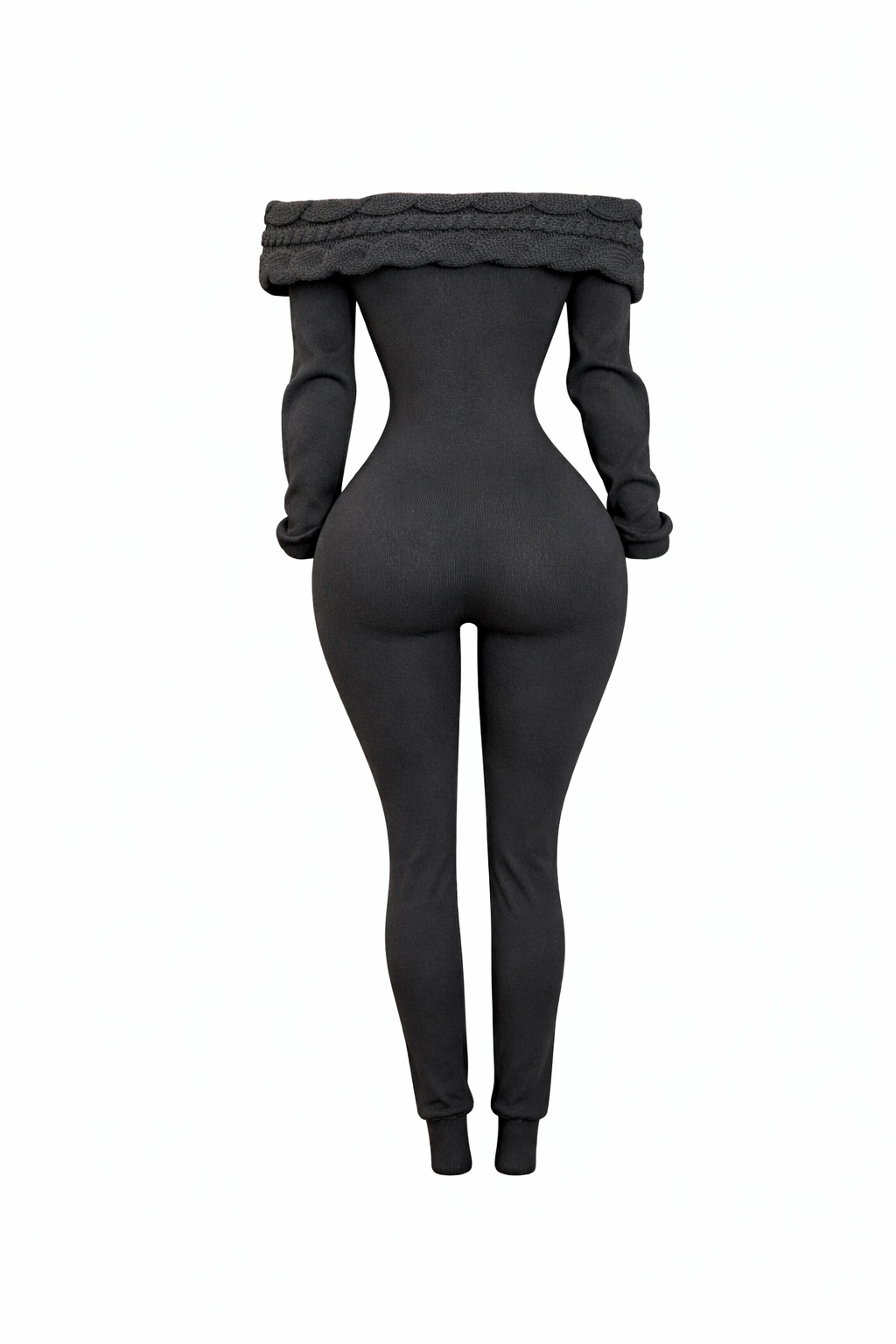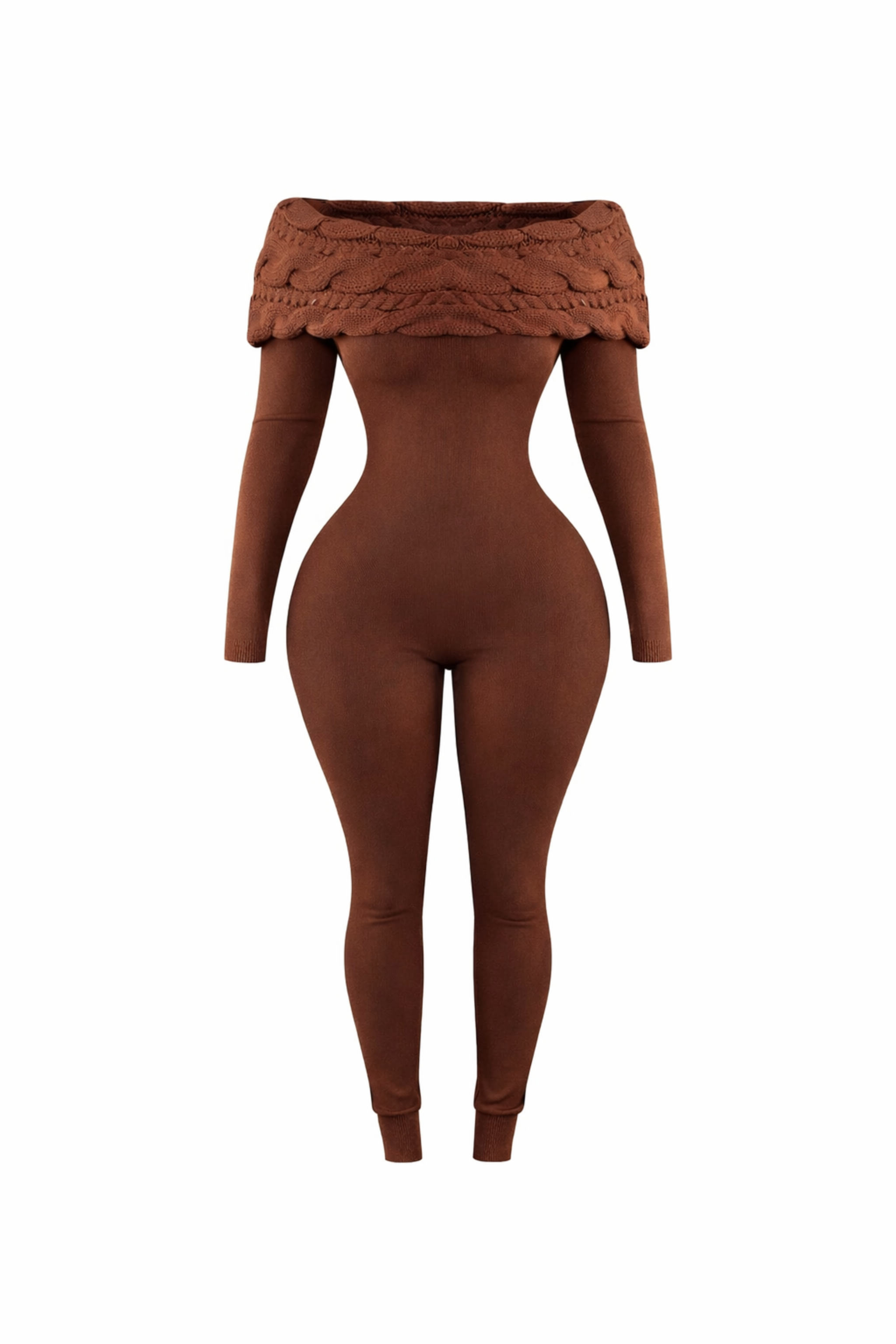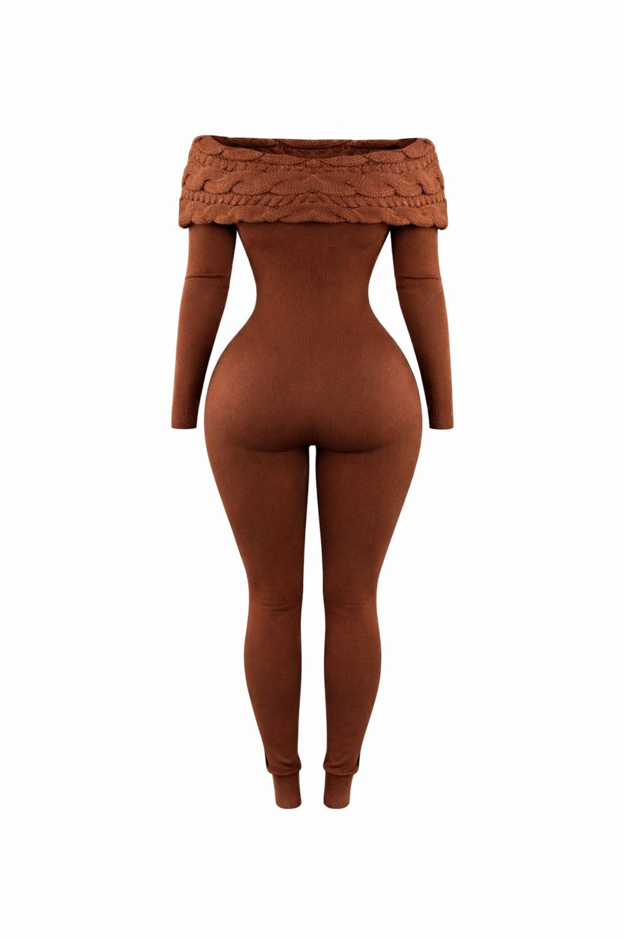 Fold-Over Off-Shoulder Knitted Jumpsuit with Long Sleeves